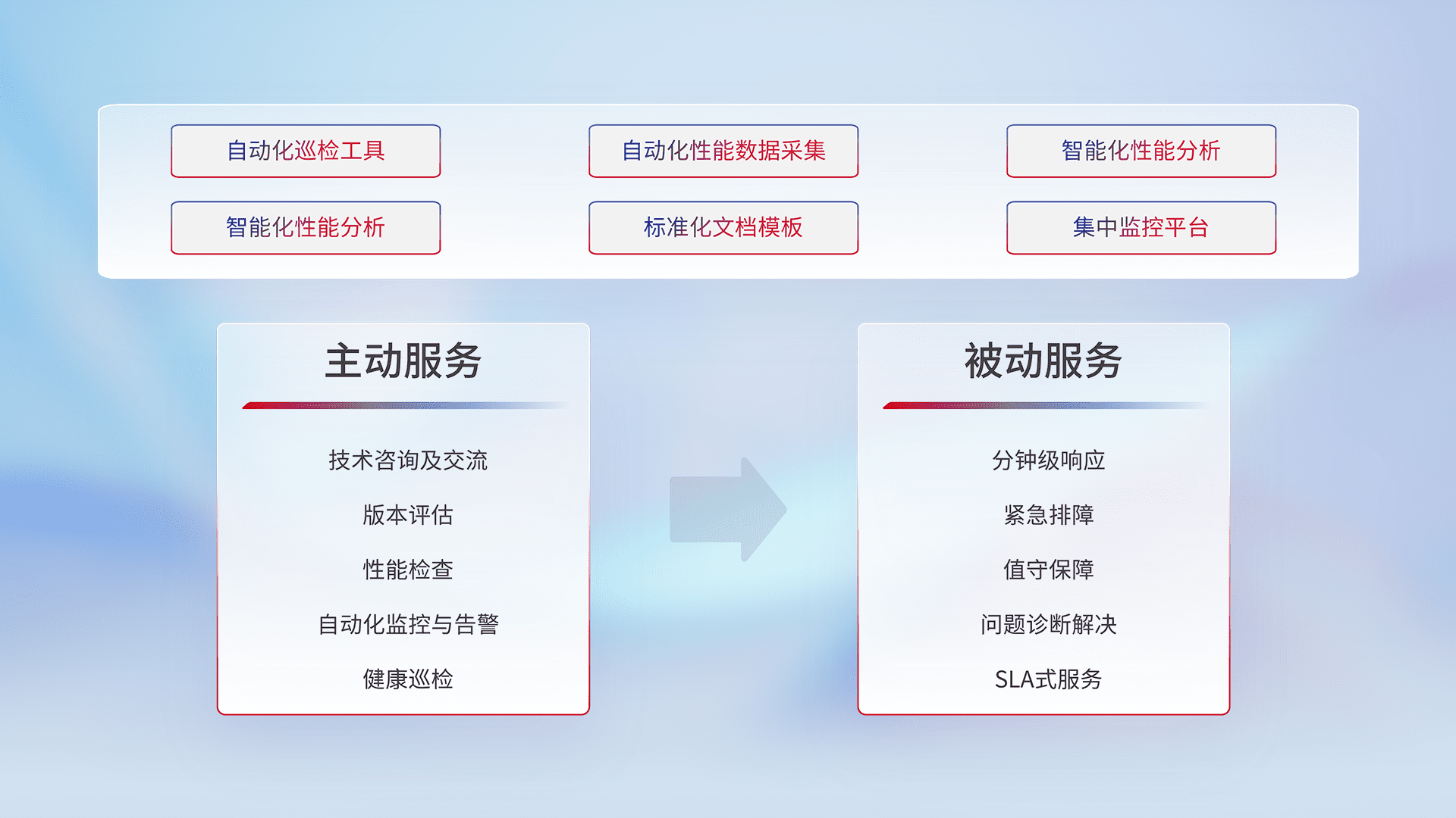 智能化工具和标准化文档,,,,保障服务质量,,,,提供主动服务(包含技术咨询、、版本评估、、、、性能检查、、自动化监控与告警、、、、健康巡检)和被动服务包含(分钟级响应、、紧急排障、、、值守保障、、、、问题诊断解决、、SLA服务)。。。